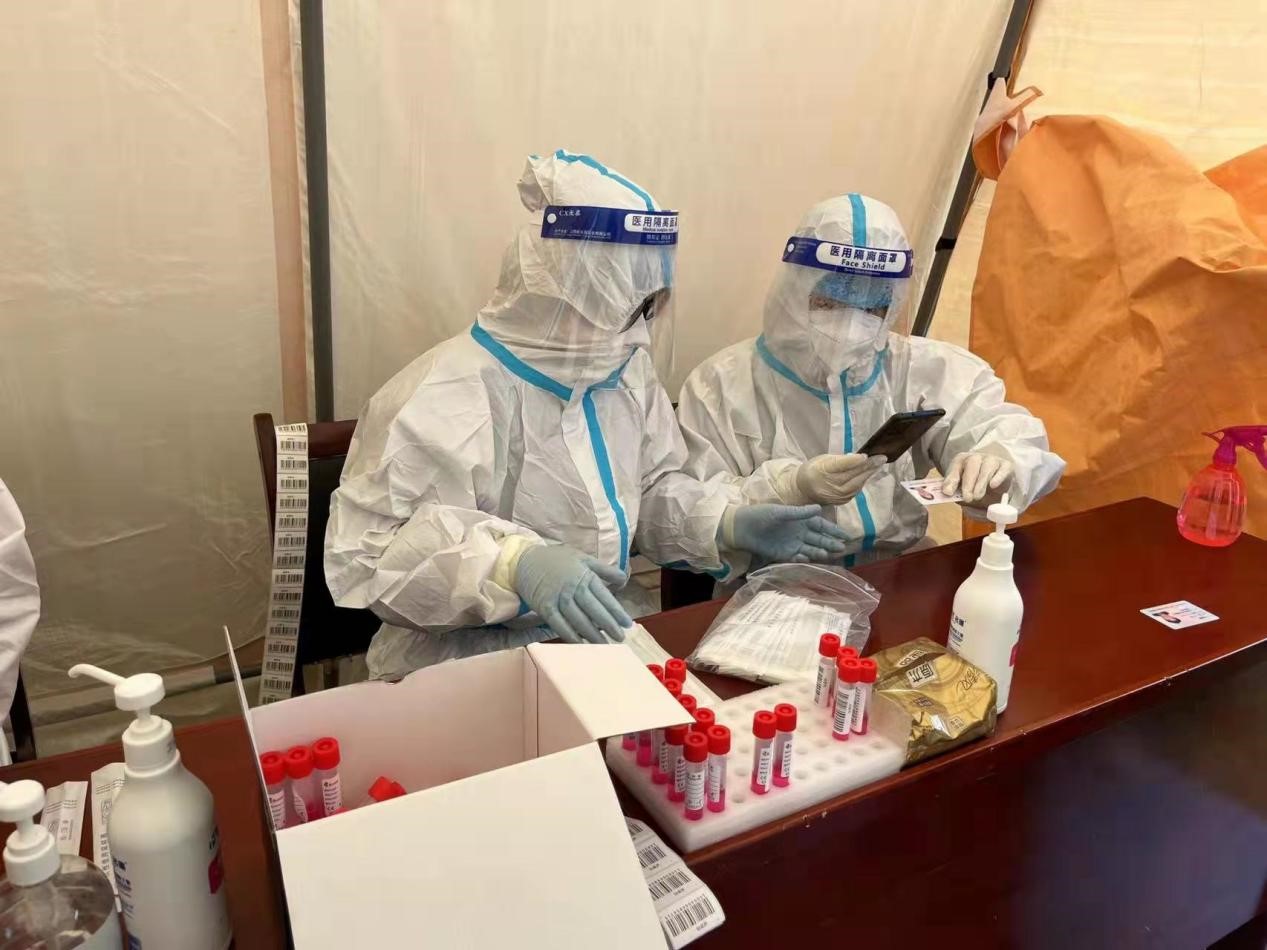 3月17日,句容啟動三輪全員核酸檢測行動。公司行政人事部周勇、龐辛看到志愿者招募通知后,第一時間響應(yīng)報名,并成功當(dāng)選為志愿者。早晨6:20分,天氣好像也受疫情影響了一樣,一掃前幾日的春光明媚,開啟了凄風(fēng)冷雨的倒春寒模式。在簡陋的帳篷里,二人和醫(yī)護人員正在進行檢測前的準(zhǔn)備工作。一邊核對著桌子上的棉簽、試管、條形碼,一邊討論著可能出現(xiàn)的意外情況。7:00檢測工作正式開啟,掃描試管標(biāo)簽、采集人員信息,引導(dǎo)人員檢測,掃描封管。……整整四個小時里,二人機械、精準(zhǔn)的重復(fù)著上述動作,協(xié)助醫(yī)護人員完成了500多人的核酸采集工作。當(dāng)二人完成交班,脫下重重防護設(shè)備時,臉上的汗珠和口罩勒痕猶如勇者的勛章一樣熠熠生輝。