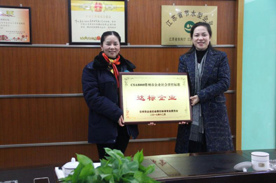 2017年,常州項目公司在黨支部和工會的大力推進(jìn)下,全面開展“和諧勞動企業(yè)”創(chuàng)建工作。公司從機(jī)構(gòu)的健全,制度臺帳的完善,規(guī)范的人事管理、形式多樣的企業(yè)文化活動、員工的技能提升培訓(xùn)、嚴(yán)格的安全管理等方面開展創(chuàng)建工作,并于2017年12月初通過常州市8個部門組成的驗收組驗收,并以94.5分的成績摘得第一名,榮獲常州市創(chuàng)建和諧勞動關(guān)系“先進(jìn)企業(yè)”稱號。同時,根據(jù)上述檢查驗收的情況,常州市企業(yè)社會責(zé)任標(biāo)準(zhǔn)專業(yè)委員會還授予公司“CSA8000常州市企業(yè)社會責(zé)任標(biāo)準(zhǔn)“達(dá)標(biāo)企業(yè)”的殊榮并授牌。CSA8000標(biāo)準(zhǔn)兼顧與國際相關(guān)標(biāo)準(zhǔn)的銜接,是SA8000(全球企業(yè)社會責(zé)任標(biāo)準(zhǔn))在常州的地方版,并具有鮮明的常州地方特色。