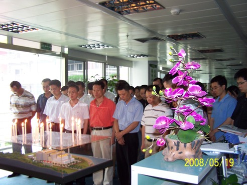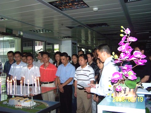 ???? 為了表達綠色動力領導和員工對地震遇難同胞的深切哀悼,5月19日下午2點28分,在集團公司執(zhí)行董事黃建中致哀悼詞后,集團公司全體領導和員工在集團公司辦公室面向點燃的“心形”蠟燭為災區(qū)死難同胞肅立默哀三分鐘。